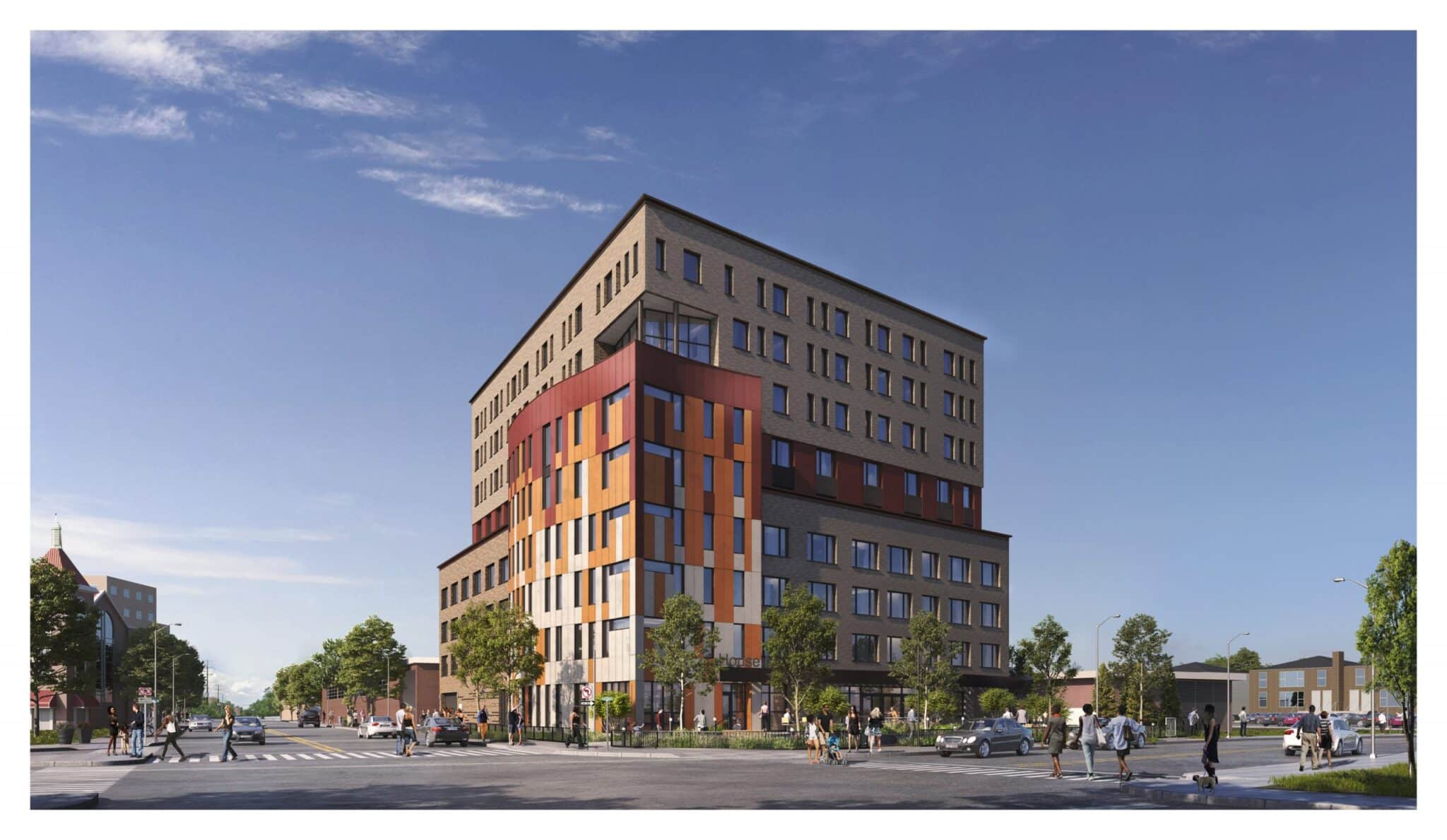 Sustainability was prioritized, with the facade featuring vibrant Swisspearl rainscreen panels combined with brick and EIFS, providing a durable, low-maintenance, and striking exterior. The building meets Enterprise Green Communities standards and is conveniently located near public transit, promoting easy access for residents.